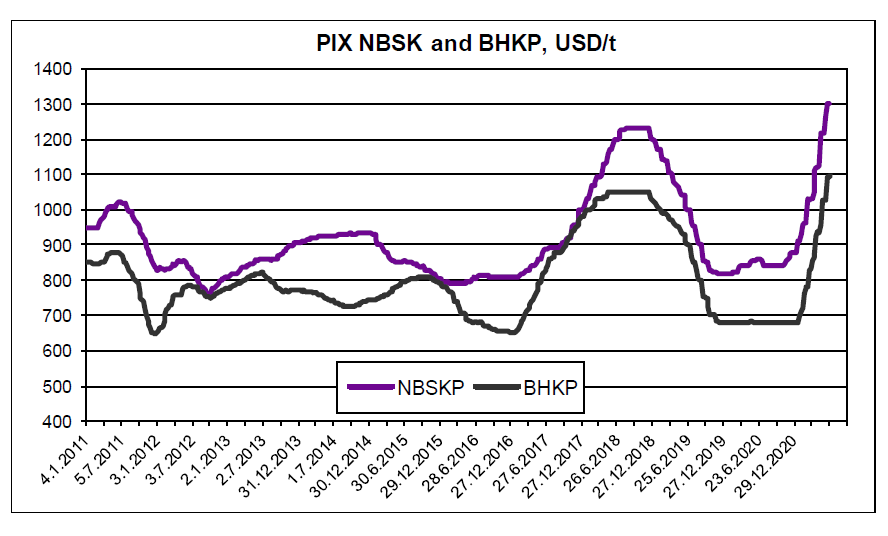 NBSK در اروپا –  آمارهای موجودی اروپا (UTIPULP’s) نشان می‌دهد که حجم خمیرکاغذ چوب نرم در ماه آوریل در حد 244478 تن بود، و 3.3% بیشتر از آوریل سال گذشته است. میزان مصرف به 297563 تن در ماه آوریل رسید که 1.8% در مقایسه با آوریل 2020 افت داشت. درنتیجه تغییرات مهمی در هر یک از طبقه‌بندی باوجود پاند می کوید -19 بر بازار بهار 2020 تأثیر نداشت. در بازار کاغذ اروپا، تولیدکنندگان اعلام افزایش قیمت کردند تا با تفاوت‌های ناشی از هزینه‌های مواد خام (خمیرکاغذ) مبارزه کنند. قیمت‌های خمیرکاغذ چوب نرم و چوب سخت در پنج ماه اول سال 2021 افزایش یافت و تولیدکنندگان در پی افزایش قیمت بیشتر در ماه ژوئن هستند. گزارش قیمت برای شاخص ما شامل تغییرات ملایم است. درهرحال، شاخص NBSK از هفته قبل ثابت بود، زیرا این تغییرات از 10% بالا و پایین داده‌های قیمت گرفته شد. درنتیجه، شاخص ارزش قبلی خود را در هفته قبل و در حد 1300 دلار در تن تکرار کرد. ضعیف شدن 1.1% یورو (متوسط هفتگی) در مقابل دلار آمریکا ایجاد افزایش صعودی در ارزش تبدیل یورو داشت، که 11.71 یورو بود، و با 1.10% به مقدار 1080.09 یورو در تن رسید. فاصله اعتماد صفر بود و نشان‌دهنده 1300 دلار در تن بود.