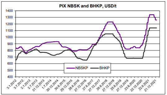 شاخص PIX NBSK از سطح خود نسبت به هفته قبل در 1260.00 دلار در تن حرکت نکرد. یورو در برابر دلار آمریکا 0.24 درصد (میانگین هفتگی) تضعیف شد که تأثیر مثبتی بر ارزش تبدیل شده شاخص به یورو داشت. این تبدیل با 2.63 یورو یا 0.24 درصد افزایش یافت و در 1109.15 یورو در تن بسته شد. فاصله اطمینان در 1,260.00-1,260.00 دلار در تن بدون تغییر باقی ماند.