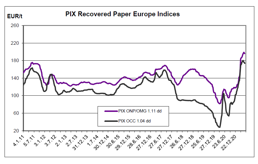 کاغذ بازیافتی در اروپا – قیمت‌های صادراتی OCC در اروپا و آمریکا به مقصد آسیای جنوبی و هندوستان اخیراً از سطوح بسیار بالا در ماه‌های مارس و آوریل افت کرده است. در اروپا، موجودی OCC در کارخانه‌ها طبق گزارش پیشرفت داشت درحالی‌که درجه بدون جوهر موجودی مواد خام تاکنون پایین بوده است. در ماه می روزهای کاری کمتری به دلیل تعطیلات اروپا وجود دارد و در حجم جمع‌آوری‌شده خود را نشان می‌دهد. ضعیف شدن اندک یورو در هفته قبل (جمعه تا جمعه) در مقابل ارزهای غیراروپایی واقعاً تأثیری در قیمت نداشت. شاخص OCC 1.04 dd مقدار 1.87 یورو افت داشت و با 1.17% به 173.61 یورو در تن رسیده است. تفاوت‌ها در مقوای بسته‌بندی به شکل زیر بوده است: 7.60 یورو برای تست لاینر 2 و به مقدار 388.71 یورو در تن، 13.67 یورو برای تست لاینر 3 و به مقدار 370.20 یورو در تن، و 9.89 یورو برای آر بی فلوتینگ به مقدار 351.67 یورو در تن رسیده است. در مورد درجه بدون جوهر، شاخص ONP/OMG 1.11 dd، 1.49 یورو کاهش داشت و با 0.76% به 195.57 یورو در تن رسیده است. تفاوت در شاخص کاغذ روزنامه 65 سنت عریض شد و به 188.71 یورو در تن رسیده است.