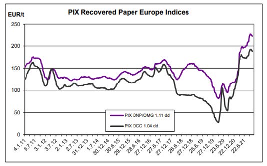 در اروپا، قیمتهای اخیر OCC که به ما گزارش شده، قیمتهای متغییری با قیمتهای بالا، پایین و بدون تغییر در ابتدای ماه بود، در حالی که آخرین قیمتهای ONP/OMG پایدارتر یا اندکی کاهش داشتند. تقویت 0.9 درصدی یورو در برابر ارزهای غیر اروپایی در هفته گذشته (میانگین هفتگی) تأثیر نزولی نسبتاً محدودی داشت. از این گذشته، بنچمارک PIX OCC 1.04 dd ما در نهایت زیان 2.71 یورویی یا 1.42 درصدی را نشان داد و در قیمت 187.57 یورو در تن باقی ماند. شاخص قیمتی کانتینربردهای مرتبط به شرح زیر افزایش یافت: 16.89 یورو در مقابل Testliner 2 به 479.44 یورو در تن ، 17.58 یورو در مقابل Testliner 3 به 454.01 یورو در تن و 13.55 یورو در مقابل RB Fluting به 442.76 یورو در تن رسید. در مورد مواد بدون جوهر ، PIX ONP/OMG 1.11 dd 1.46 یورو یا 0.65 درصد کاهش یافت و به 222.06 یورو در تن رسید. حاشیه چاپ روزنامه PIX با 2.37 یورو افزایش یافت و به 222.93 یورو در تن رسید.