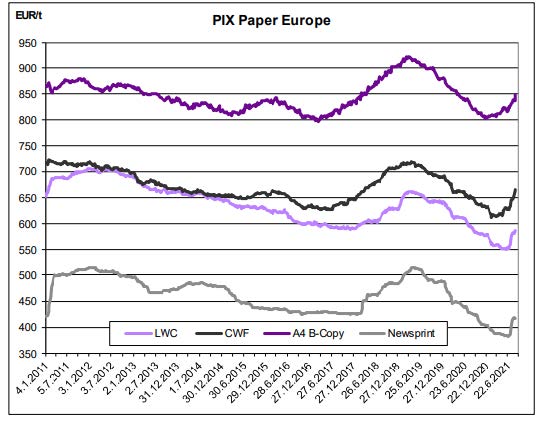 بر اساس معیار ما ، قیمت کاغذهای کپی در بیشتر سه ماهه اول ثابت بوده است ، اما افزایش قیمتها در سه ماهه دوم به طور جدی شروع شد. با احتساب شاخص قبلی در اوایل دسامبر سال گذشته ، شاخص ما تا کنون حدود 44 یورو افزایش یافته است. این در مقایسه با کاهش 118 یورویی قبل از آن ، از مارس 2019 شروع می شود. سطح فعلی معیار کاغذ کپی ما معادل ماه می سال گذشته است. جدیدترین گزارشات به معیار ما ترکیبی نسبتاً مساوی از قیمتهای پایدار و برخی از قیمتهای عمدتا افزایش یافته را نشان می دهد. به طور کلی ، تقویت 0.8 درصدی یورو در برابر ارزهای غیر اروپایی(جمعه-جمعه) گرایش نزولی را به همراه داشت. در مجموع ، شاخص کاغذ PIX A4 B-copy با 10.77 یورو یا 1.29٪ افزایش یافت و به 847.44 یورو در تن رسید.