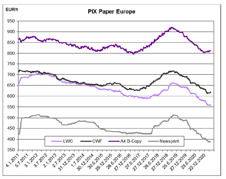 طبق اطلاعات PPPC، تقاضا در اروپای غربی برای کاغذ چاپ و تحریر حدود 15% نسبت به سال قبل در ماه فوریه افت داشتهاست. در سال قبل، در ماه فوریه قبل از کوید-19 در اروپا، و به طور کلی افت مصرف در این سال حدوداً 20% بوده است. نسبت حمل به ظرفیت در حد میانه 80s در ماه فوریه بود و نسبت به فوریه 2020 تغییری نداشتهاست. در حالی که، به طور کلی افت متوسط 80s در سال گذشته تا 70s در سال جاری داشته است.