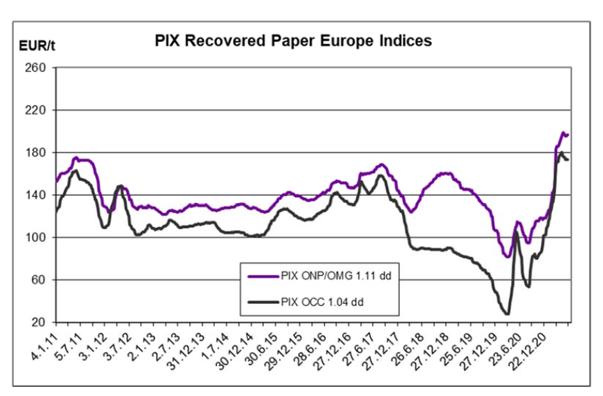 گزارش قیمت هفته گذشته پایدار و رو به پایین در مورد OCC بود، درحالیکه قیمت ONP/OMG شاهد تغییراتی بالا و پایین علاوه بر پیشنهادها ثابت بود. ضعیف شدن 0.2% یورو در هفته قبل (جمعه تا جمعه) در مقابل ارزهای غیراروپایی اندکی فشار رو به بالا داشت، و بستگی به ترکیب ارزی برای هر شاخص داشت. شاخص OCC برای کاغذ موجدار و مقوا 37 سنت افت داشت و با 0.21% به 173.49 یورو در تن رسید. تفاوت در مقوای بستهبندی به شرح زیر تغییر کرد: 5.88 یورو برای تست لاینر 2 و به مقدار 397.56 یورو در تن رسید، 36 سنت برای تست لاینر 3 و به مقدار 377.84 یورو در تن، و 7.70 یورو برای آر بی فلوتینگ به مقدار 365.29 یورو در تن. در مورد درجه بدون جوهر، شاخص ONP/OMG افزایش 1.42 یورو داشت و با 0.73% به مقدار 196.95 یورو در تن رسیده است. تفاوت شاخص کاغذ روزنامه 1.04 دلار کاهش داشت و به 187.91 یورو در تن رسید.