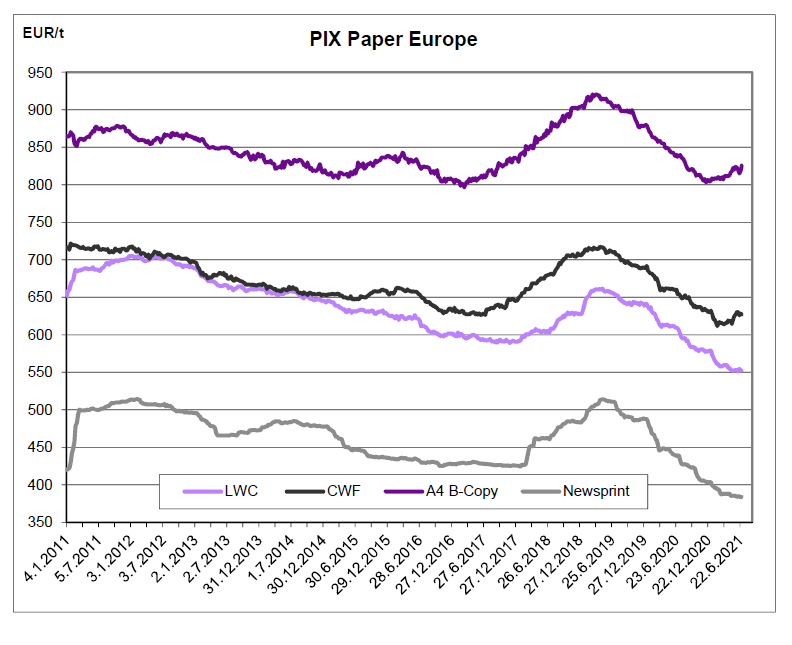LWC – کل  محموله‌های اروپا برای کاغذ مکانیکی روکش‌دار در ماه آوریل 334000 تن بود و نسبت به سال قبل 10.3% افزایش داشت (ارقام یورو گراف). دوره ژانویه تا آوریل دارای افت 11.9% بود و به 1302 میلیون تن رسید. صادرات این درجه 27.5% کل محموله‌ها،  و در ماه آوریل 92000 تن بود که تا حدی نسبت به آوریل 2020 جهش داشت. تقاضای تخمینی اروپا برای LWC افزایش 15.3% برای ماه آوریل داشت، و نسبت به سال قبل در همین زمان افت 10.6% داشت. قیمت‌های جمع‌آوری‌شده برای این شاخص شامل افزایش و کاهش در میان پیشنهاد‌های ثابت بود. ضعیف شدن 0.1% یورو در مقابل ارزهای غیراروپایی (جمعه تا جمعه) تا حدی کشش رو به بالا داشت. شاخص LWC پایین آمد و با 1.18 یورو با 0.21% به مقدار 552.08 یورو در تن رسید.