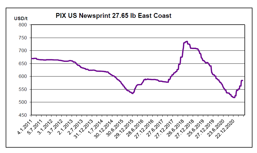 کاغذ روزنامه در آمریکا – سرمایه‌گذاری آلدن گلوبال خرید انتشارات تریبون را در هفته گذشته به پایان رساند و آن شرکت را به تملک خود درآورد. تریبون از دیون خود آزاد شد، اما شرکت سرمایه‌گذاری بلافاصله قدرت نفوذ خود را با دو وام به مبلغ 278 میلیون دلار نشان داد و کارگران روزنامه را در اختیار پیشنهاد خرید گذاشت، و طبق گزارش شیکاگو تریبون یکی از روزنامه‌ها در اختیار گرفته شد. در سایر نقاط، گروه پاکستون مدیا روزنامه لند مارک کامیونیتی را خریداری کرد که زنجیره 46 روزنامه روزانه و هفتگی است، که تقریباً نیمی از آن در کنتاکی قرار دارد. هفته قبل، خدمات پست آمریکا افزایش قیمت بیشتر از 8% را در متوسط پست‌های دوره‌ای اعلام کرد، که توسط روزنامه‌های محلی استفاده می‌شود، و ائتلاف رسانه‌های خبری از تحرک در بزرگ بودن در این زمان انتقاد کردند. بازار کاغذ روزنامه نیز شاهد اعلام افزایش قیمت بود (گزارش PPI Pulp & Paper Week). اکثر کارخانه‌ها درخواست افزایش 50 دلار کردند، حتی بین ماه‌های جولای و اوت، اگرچه کاغذسازی ایروینگ این زمان را به ژوئن و جولای محول کرده است. قیمت‌های کاغذ روزنامه در آمریکا در سال جاری در حال افزایش بود و به مقدار کلی 66 دلار تاکنون طبق شاخص رسیده است. درهرحال، گزارش‌ها از تغییرات قیمت در هفته قبل رسیده است. درنتیجه شاخص کاغذ روزنامه 27.65 پوندی در آمریکا 584.23 دلار در تن ثابت بوده است.
