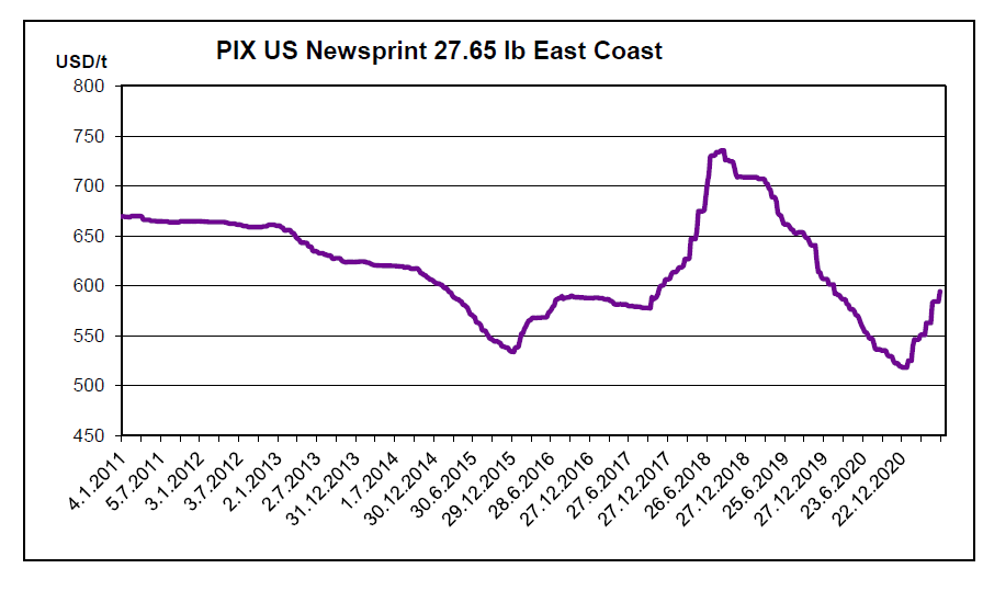 کاغذ روزنامه در آمریکا –  خطوط هوایی آمریکا آخرین نسخه مجله پروازی راه آمریکا را در ماه ژوئن منتشر می‌کند (گزارش آمریکای امروز). این عنوان به‌صورت جزوه 22 صفحه‌ای در سال 1966 شروع شد و به 122 صفحه افزایش یافت که به‌صورت مجله ماهیانه برای 16 میلیون مسافر قبل از باندمی چاپ می‌شد. خطوط هوایی دلتا و جنوب غربی قبلاً تولید مجله‌ها را طی بحران ویروس کرونا متوقف کردند و تصمیم گرفتند دوباره چاپ نکنند. گروه رسانه‌ای ویسکونسین یک شرکت وابسته به گروه رسانه‌ای اورواک، گروه روزنامه‌های متحده (UNG) از ارتباط وودوارد در یک معامله در 30 ژوئن خریداری می‌کند. UNG منتشرکننده نشریه چهارهفته‌ای در اورگن، ورونا، فیچبورگ، و استاتون است، که همگی در ویسکونسین واقع‌ شده‌اند. همان‌طوری که واکسیناسیون کوید – 19 ادامه دارد و اجتماع بازگشایی می‌شود، بخش‌های زیادی با کمبود نیروی کار مواجه می‌شوند، که شامل انتشارات هم می‌شود. شبکه آمریکای امروز اخیراً گفت که تلاش می‌کند رانندگان تحویل‌دهنده را برای توزیع روزنامه پیدا کند، که 10% از راه‌های آمریکا اکنون بازشده است. در مورد قیمت روزنامه، گزارش هفته قبل شامل قیمت‌های بالا شامل کسب‌وکار ماه می‌بوده است. درنتیجه، شاخص کاغذ روزنامه 27.65 پوندی در آمریکا افزایش 10.10 دلاری داشت و با 1.73% به 594.33 دلار در تن رسید.